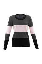 Soft scoop neckline sweater in a 3 colour way block design with button detail to neckline