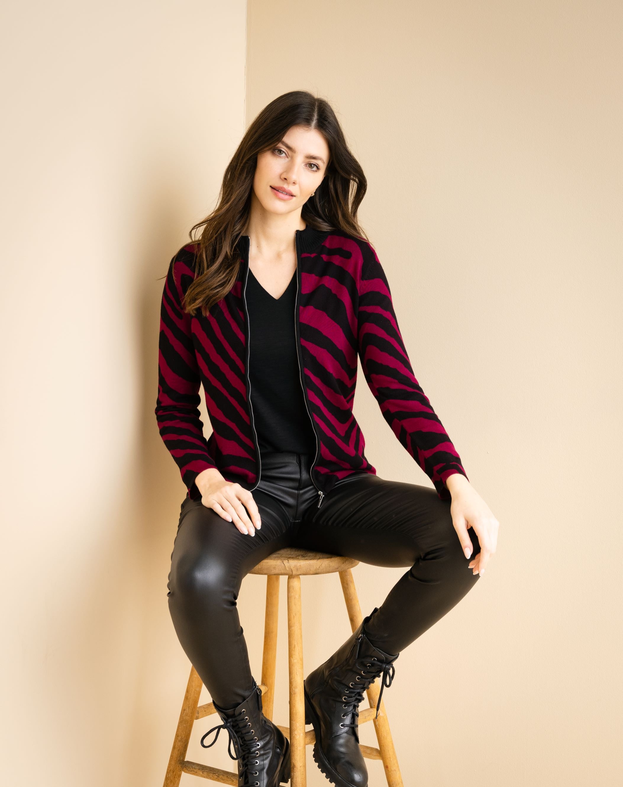 This Animal print Polo neck style cardigan with zip fastening is a classic fit .