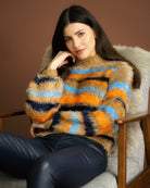 This super soft feather yarn knitted sweater with crew neckline is a relaxed fit .