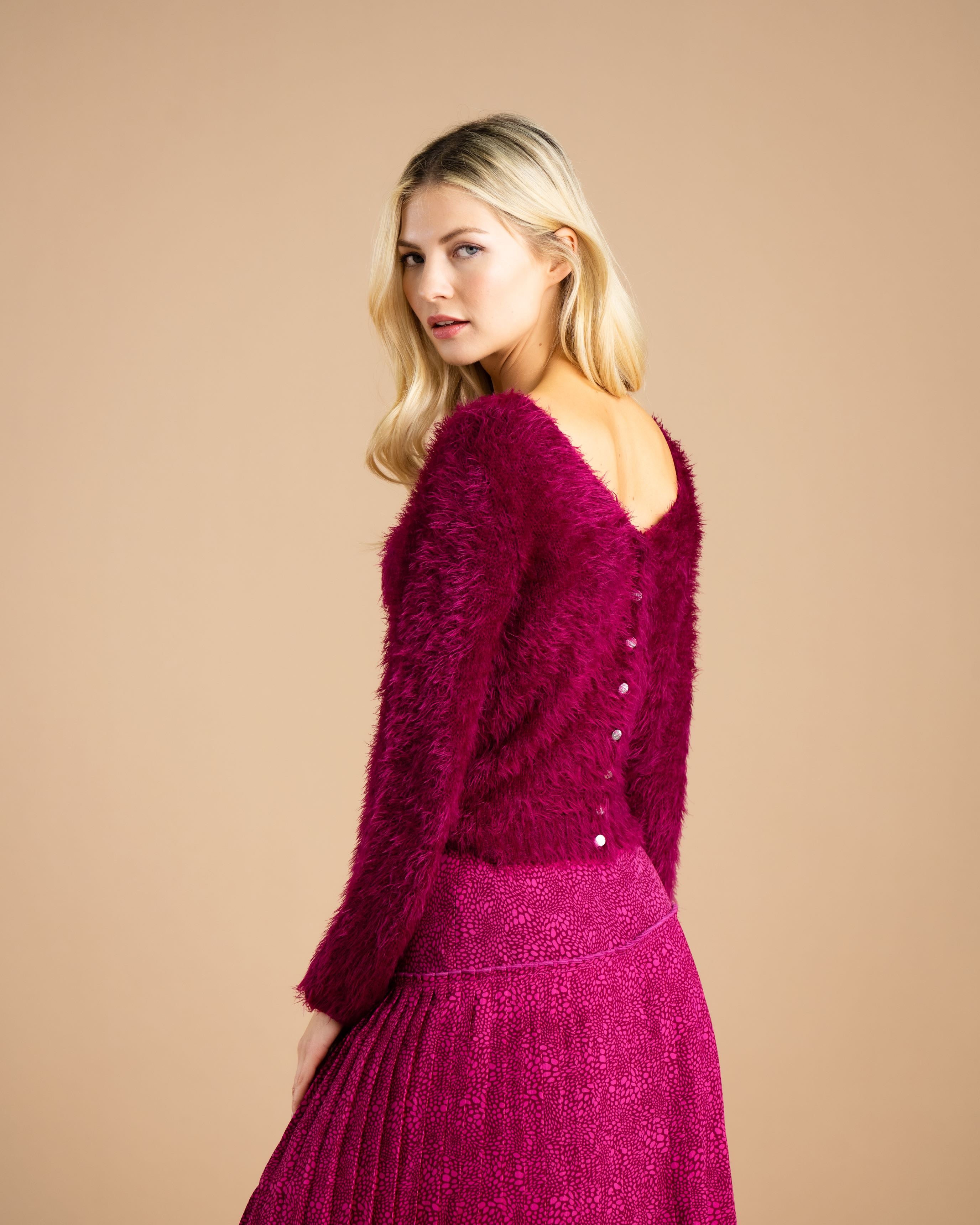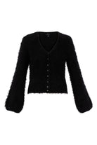 This soft feather yarn knitted cardigan with v neckline has a full sleeve with button cuff. and the option to wear reverse