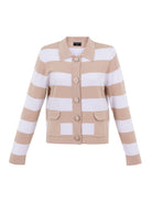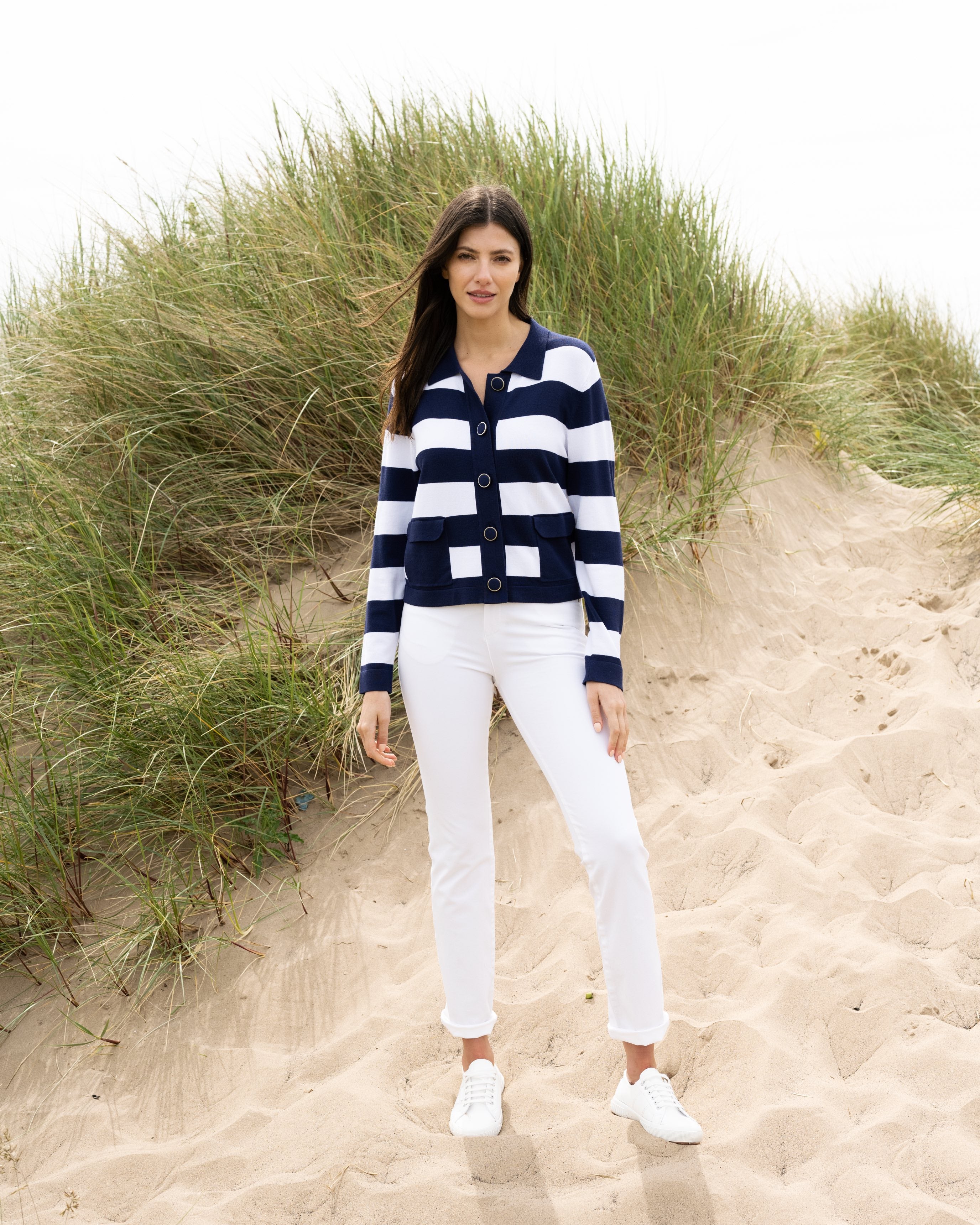 This Viscose mix cardigan in a stripe design has utility pockets and covered buttons