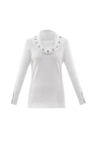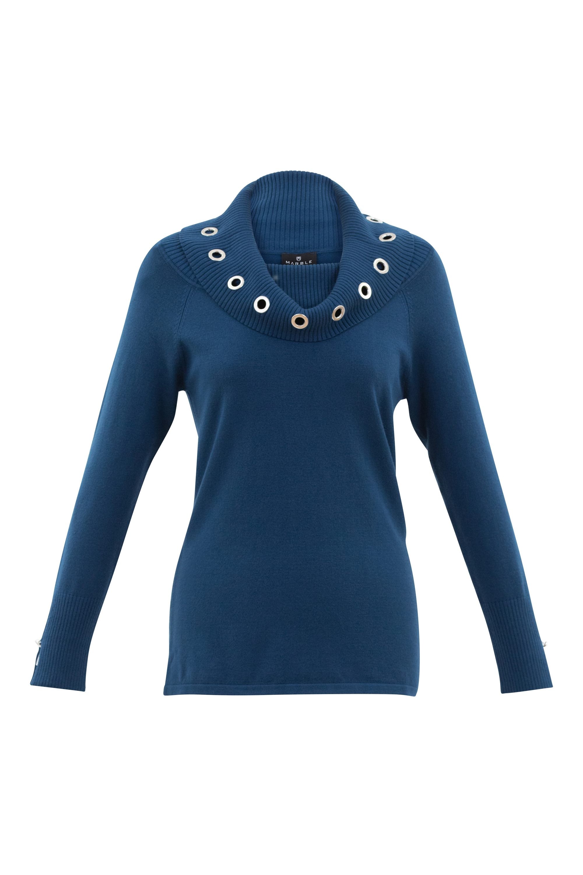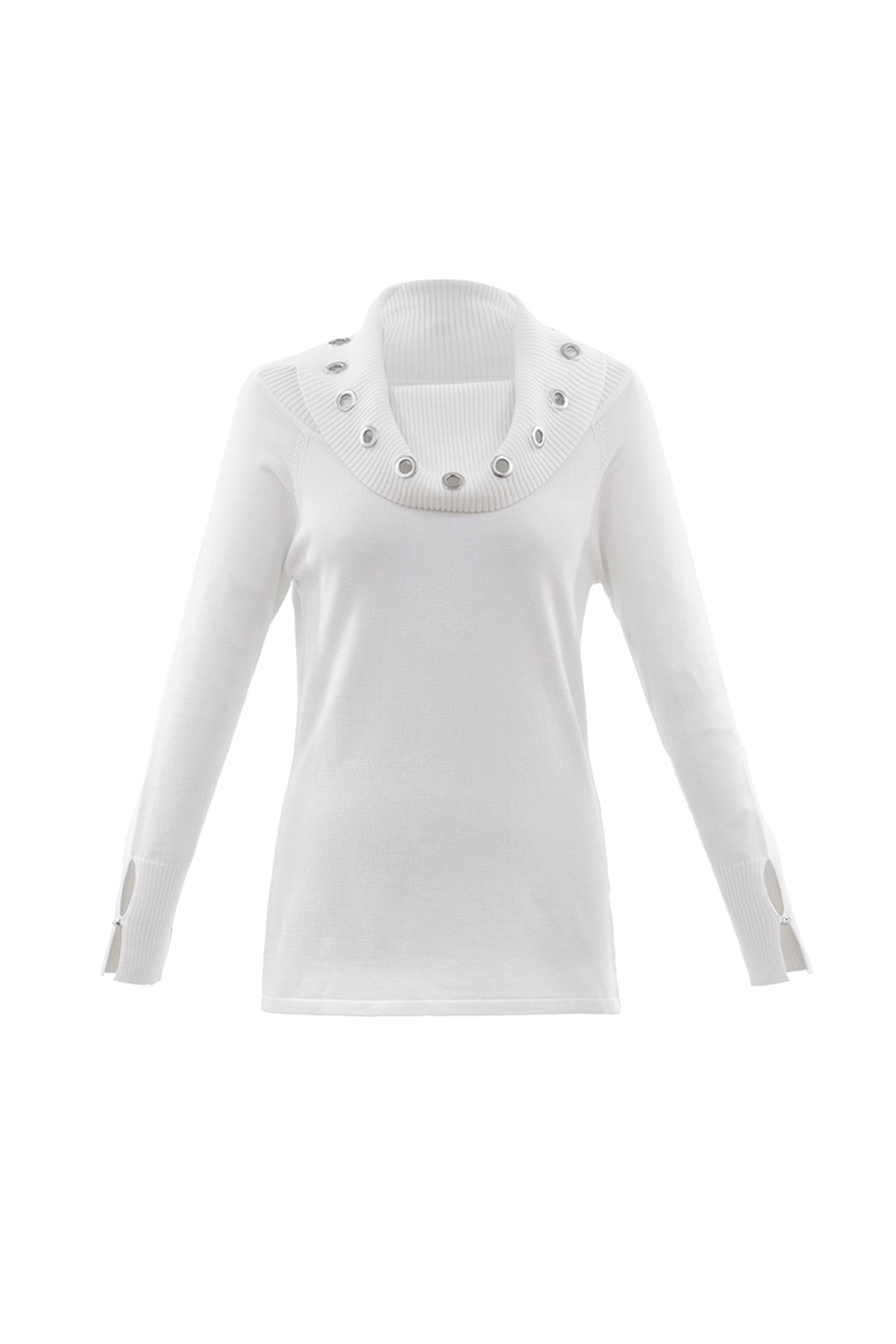 Long sleeved sweater with metal ring detail around neckline.