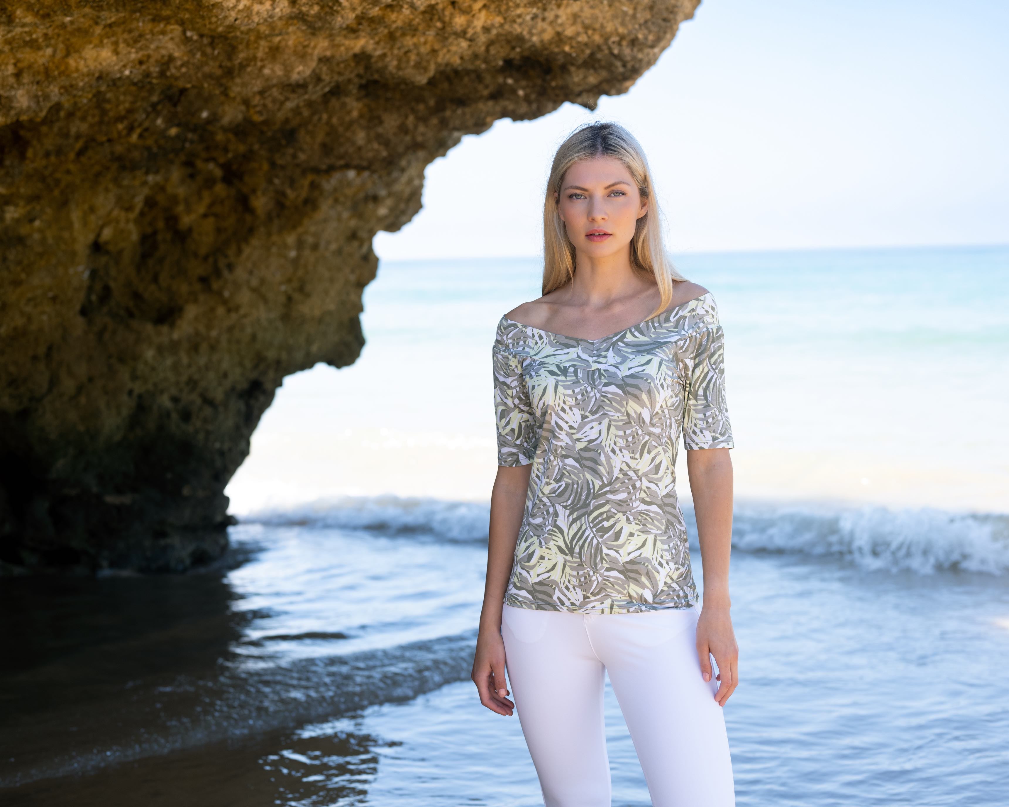 This print top by Marble has a bardo style neckline with an elbow length sleeve