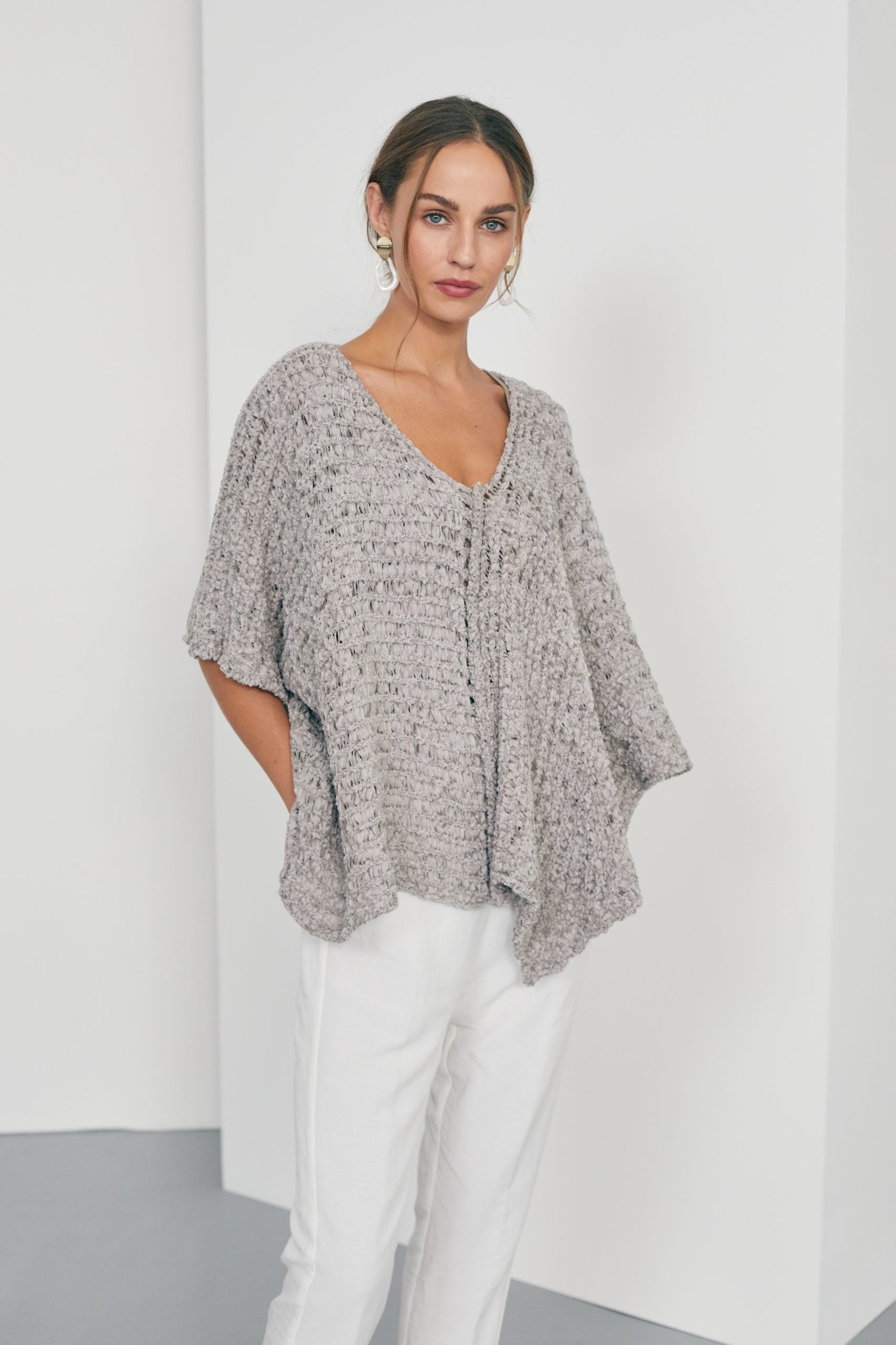 This relaxed fitting open loop knitted top by Naya has a v neckline with a drop sleeve .
