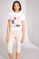 T Shirt top by Peruzzi with a contrasting sand design to front panel.
