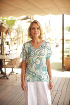 A v neck top by Pomodoro in this delicate aqua print. Loose fitting with a short sleeve.