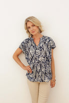 Casual blouse by Pomodoro in palm leaf print. Button through style with short sleeves.