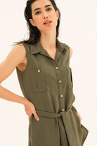 This sleeveless tunic top has front patch pockets and optional tie belt to waist. Looks great with matching skirt Sanika from the same collection