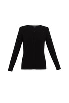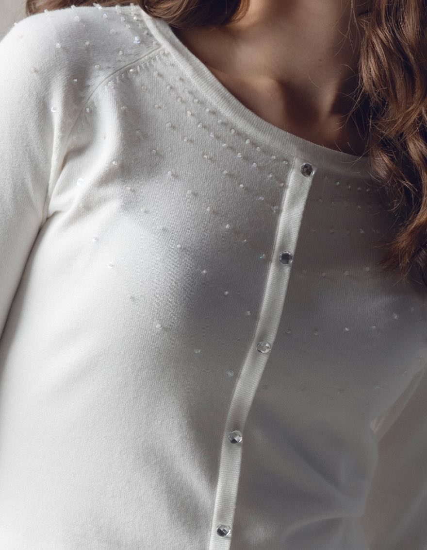 This stylish sweater by Marble in a soft viscose mix has a round neckline and raglan sleeve. A mock placket with button detail. And bugle beading detail.