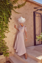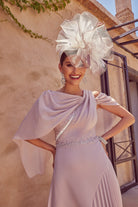 This stunning dress by Veni Infantino in crepe voile has a cold shoulder to one side of the neckline with a drape creating a sleeve . The bodice has an embellishment of beads.