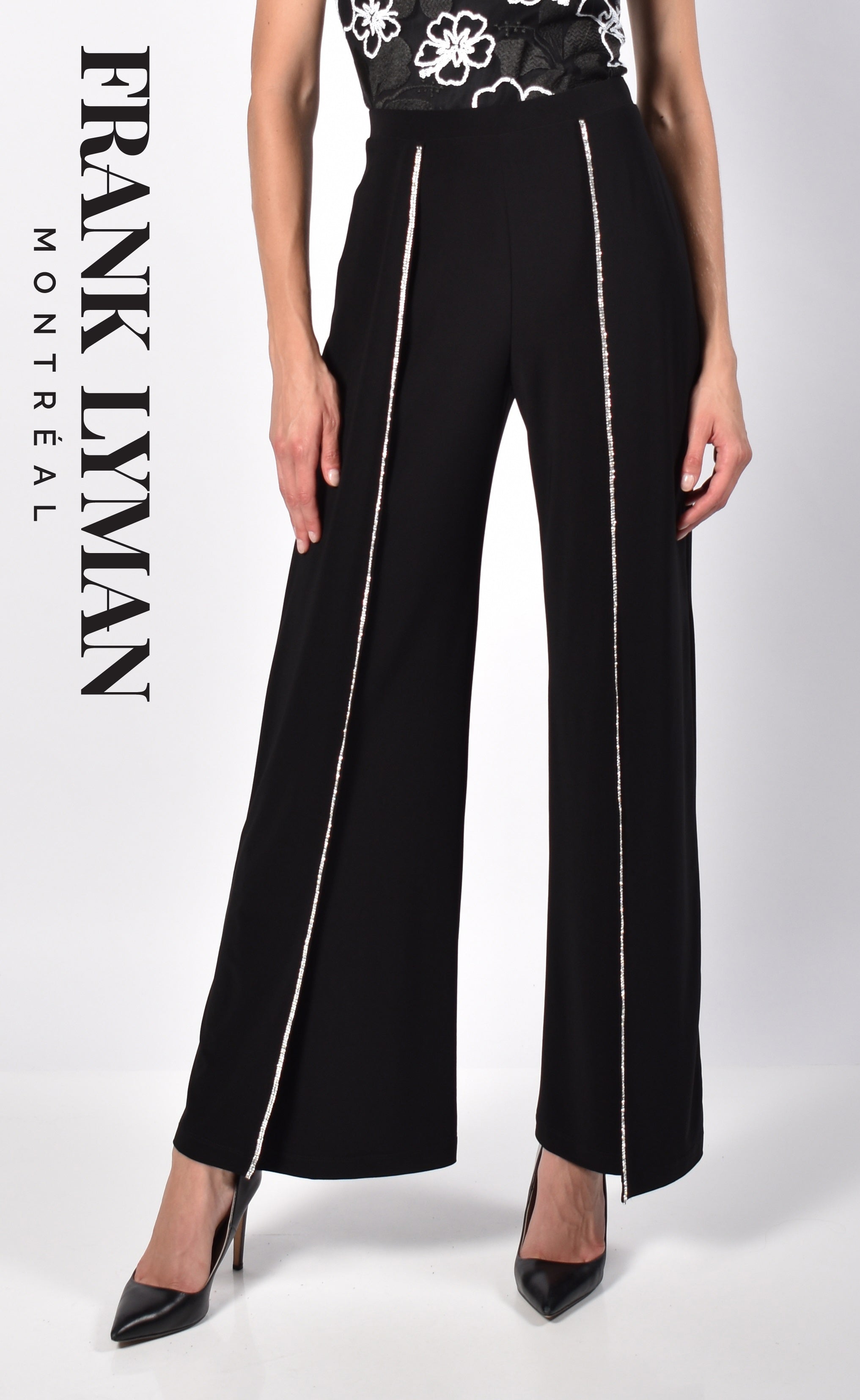 t Jersey knit trousers by Frank Lyman . Pull on style with diamanté detail down front of leg . Split front to knee creating hemline swing.