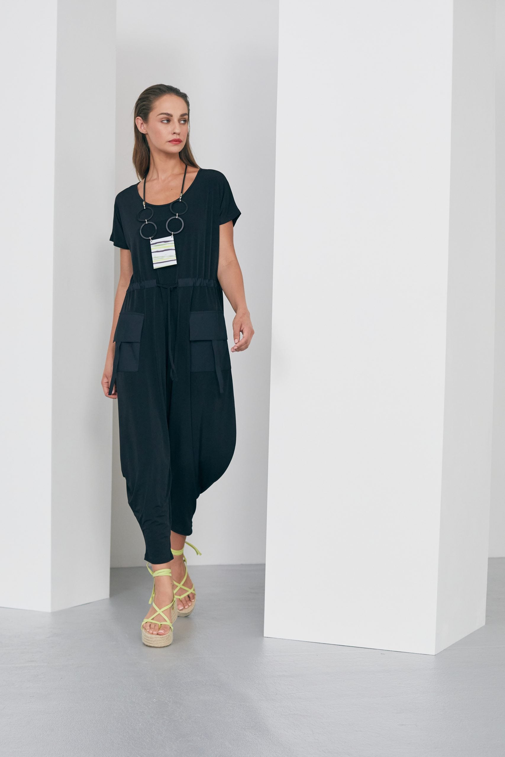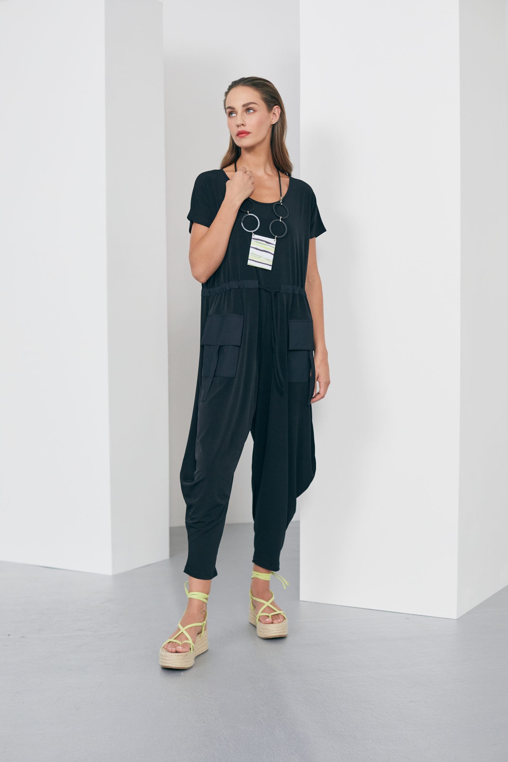 This all-in-one by Naya has a draw string waist , front patch pockets and cuffed trousers hem. Looks fantastic with the long jacket NA23141