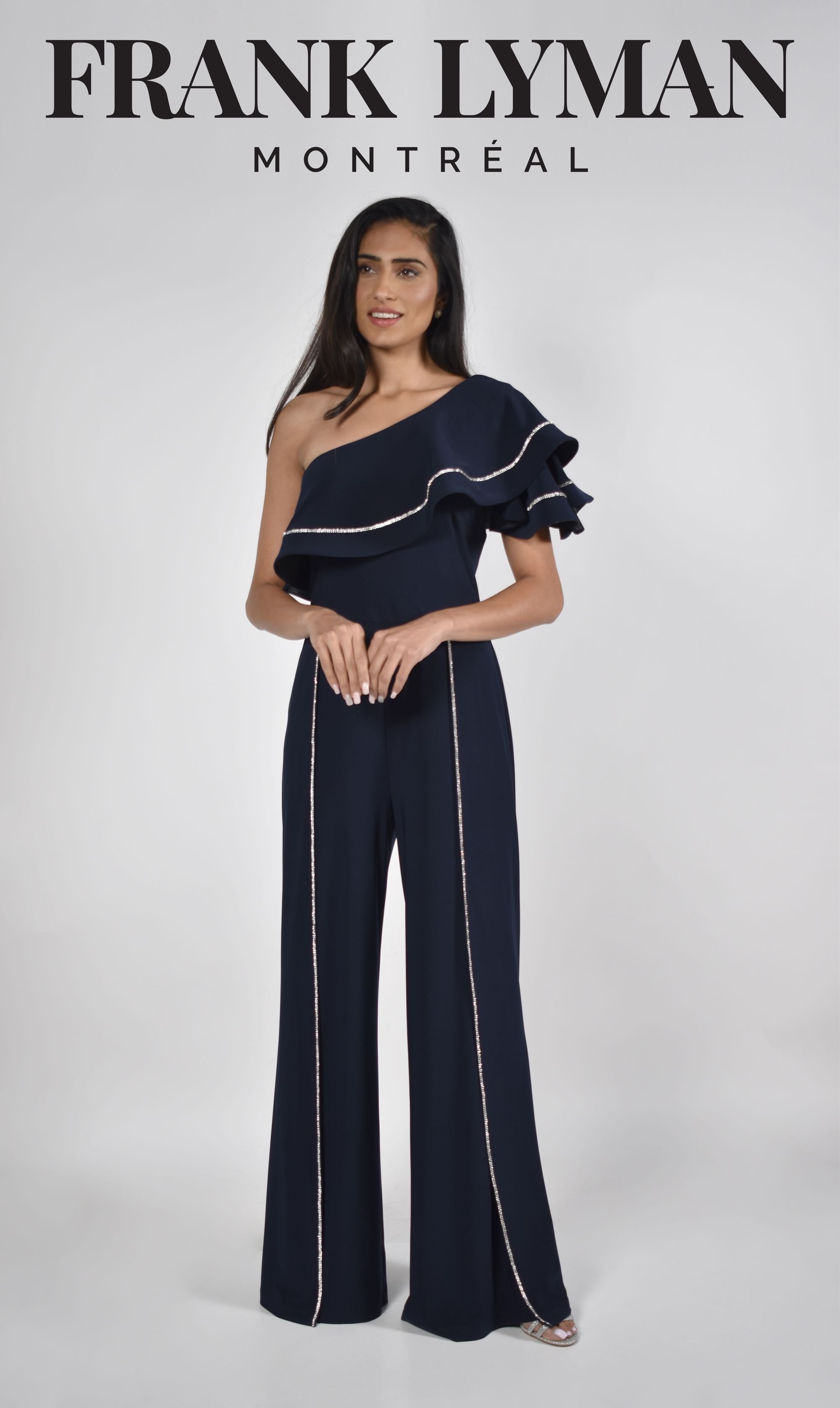 This stunning all-in-one by Frank Lyman has a ruffled one shoulder bodice with diamanté's detail which is also on the split trouser legs